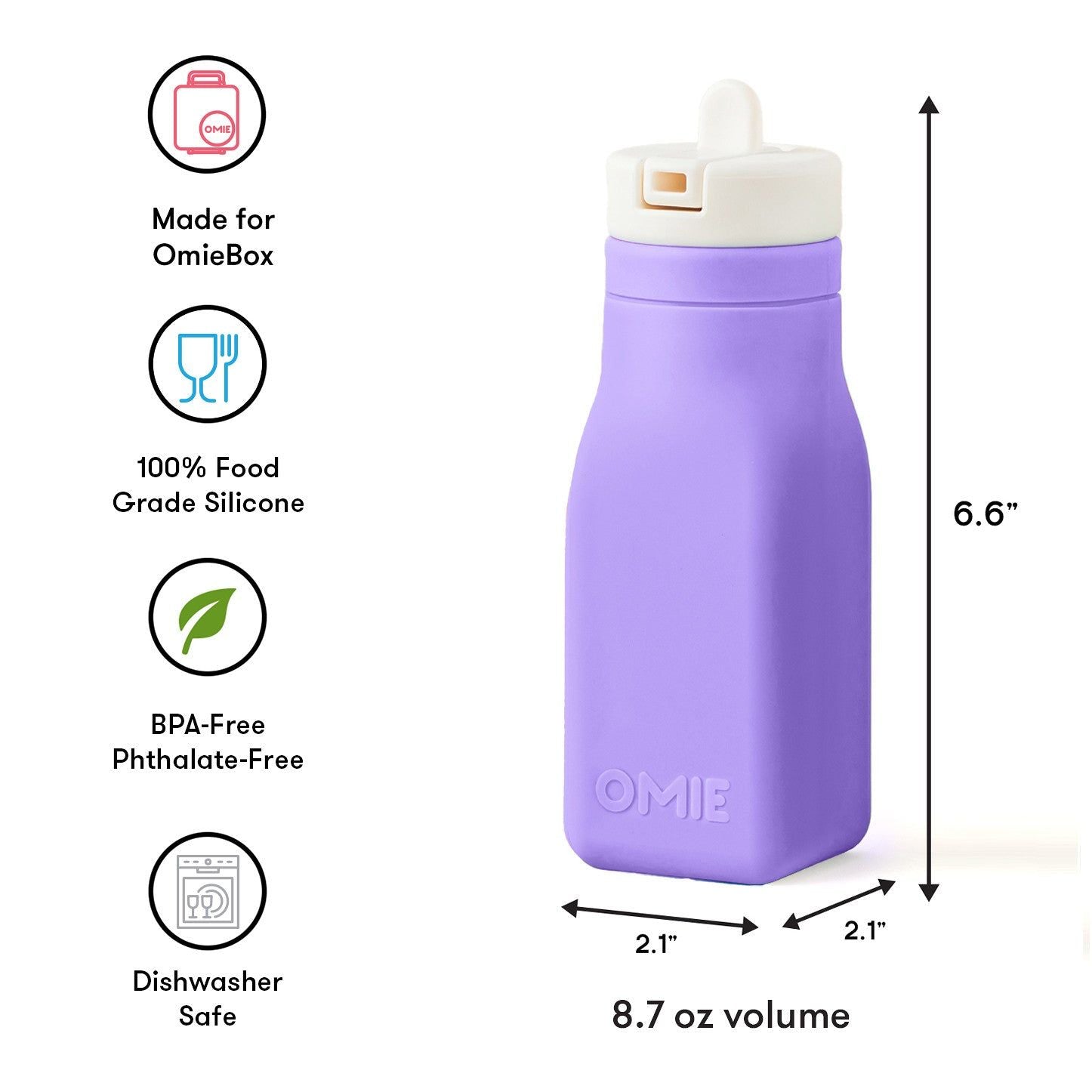 Botella de agua de silicona está diseñada para encajar perfectamente en la OmieBox® rediseñada. El pitillo giratorio ayuda a los niños a mantenerse hidratados, con capacidad para hasta 250 ml de líquido.